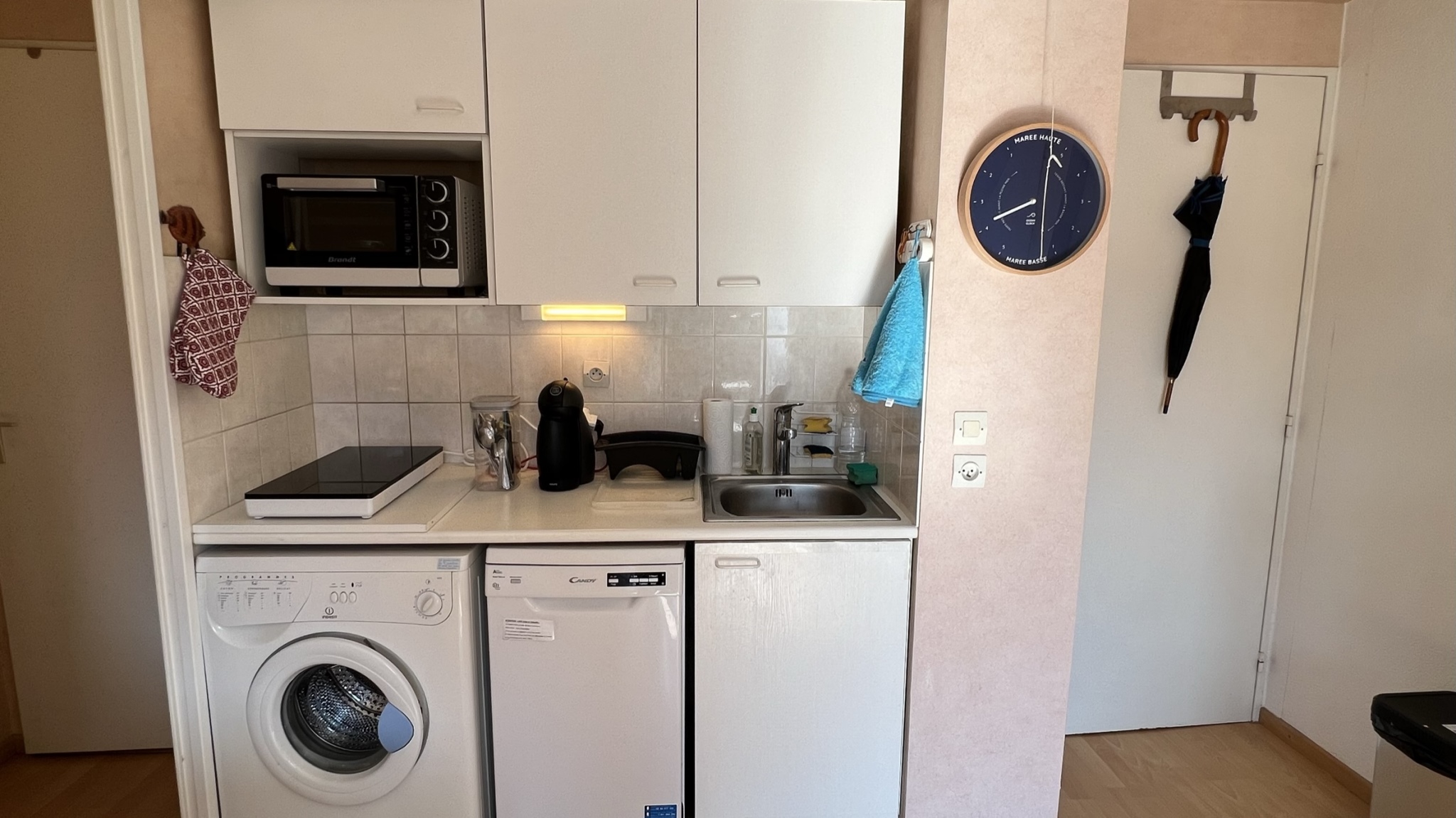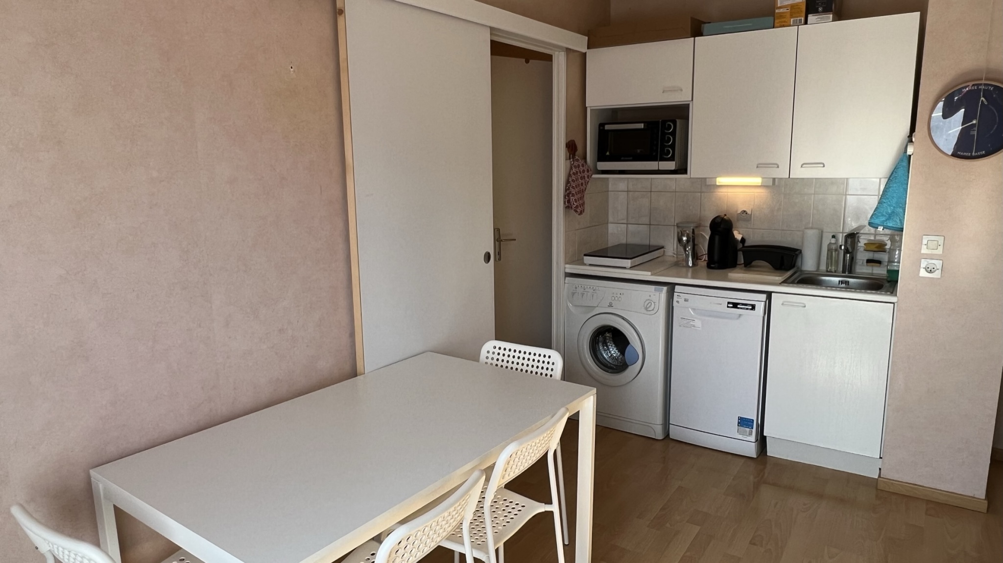 L'appartement comprend : un séjour (avec une TV écran plat) avec cuisine ouverte entièrement équipée (2 plaques induction, un four, un four micro-ondes, un réfrigérateur/congélateur, un lave-vaisselle, un lave-linge, et une cafetière Dolce-Gusto), une 1ère chambre (avec 1 lit double 140x190), une 2ème chambre (avec lits superposés 90x190) une salle de bains (douche et meuble vasque) et des WCs séparés.